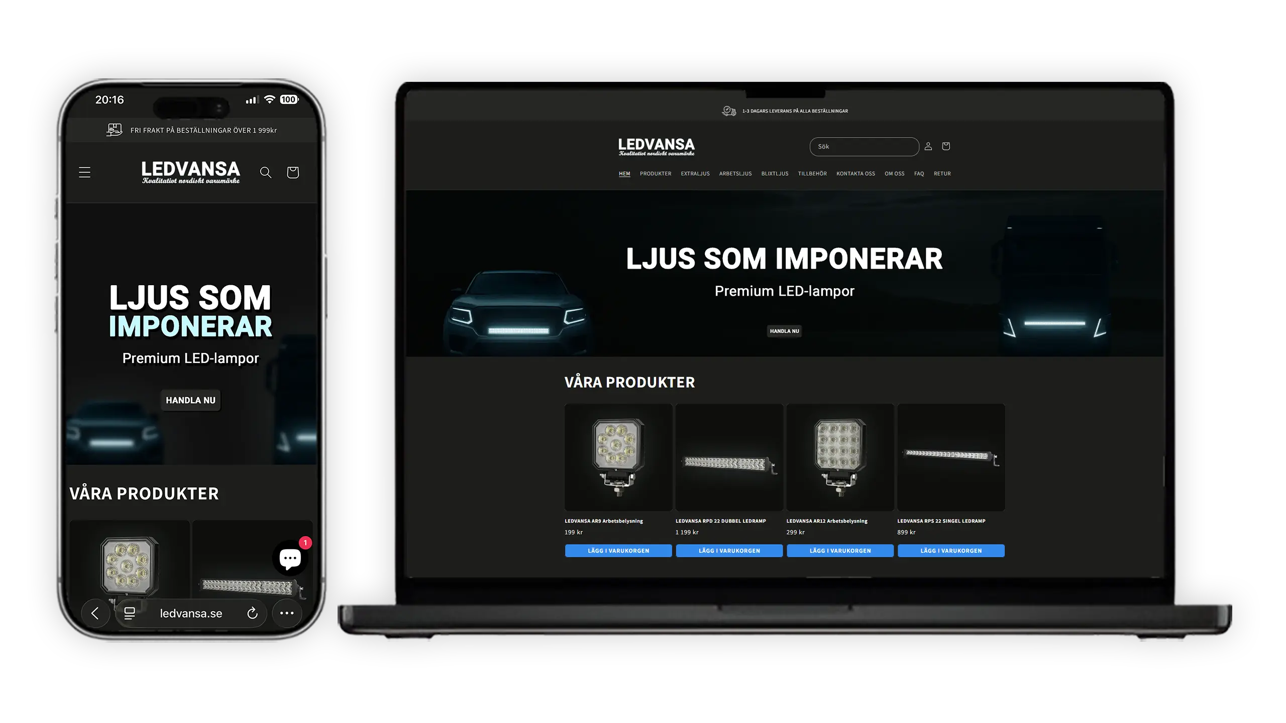 En premium e-handel för fordonsbelysning där produkterna står i centrum. Vi skapade en blixtsnabb butikslösning som förenklar köpresan och gör det enkelt att hitta rätt ljus.